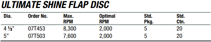 Type: Flap Disc | Series: ULTIMATE SHINE | Diameter (in.): 5 | RPM: 7600 | Abrasive Material: | Sold by Box of: 5 | __quantity: 5