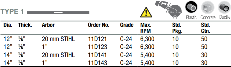Type: Cut-Off Wheel | Series: PORTACUT | Diameter (in.): 14 | Arbor Hole (in.): 1 | Thickness (in.): 1/8 | Grade: C-24 | RPM: 5400 | Wheel Type: Type 1 | Sold by Box of: 10 | __quantity: 10