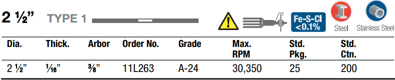 Type: Cut-Off Wheel | Series: ZIP | Diameter (in.): 2-1/2 | Arbor Hole (in.): 3/8 | Thickness (in.): 1/16 | Grade: A-24 | RPM: 30350 | Wheel Type: Type 1 | Sold by Box of: 25 | __quantity: 25