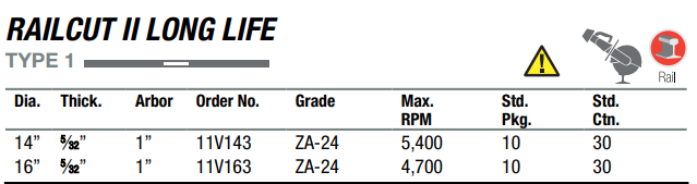 Type: Cut-Off Wheel | Series: RAILCUT II LONG LIFE | Diameter (in.): 14 | Arbor Hole (in.): 1 | Thickness (in.): 5/32 | Grade: ZA-24 | RPM: 5400 | Wheel Type: Type 1 | Sold by Box of: 10 | __quantity: 10