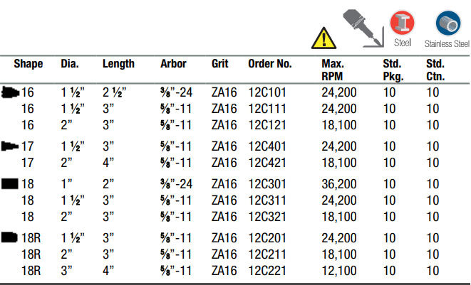 Type: Grinding Plug | Shape: 18R | Diameter (in.): 3 | Length (in.): 4 | Arbor Hole (in.): 5/8 - 11 | Grit: 16 | RPM: 12100 | Sold by Box of: 10 | __quantity: 10